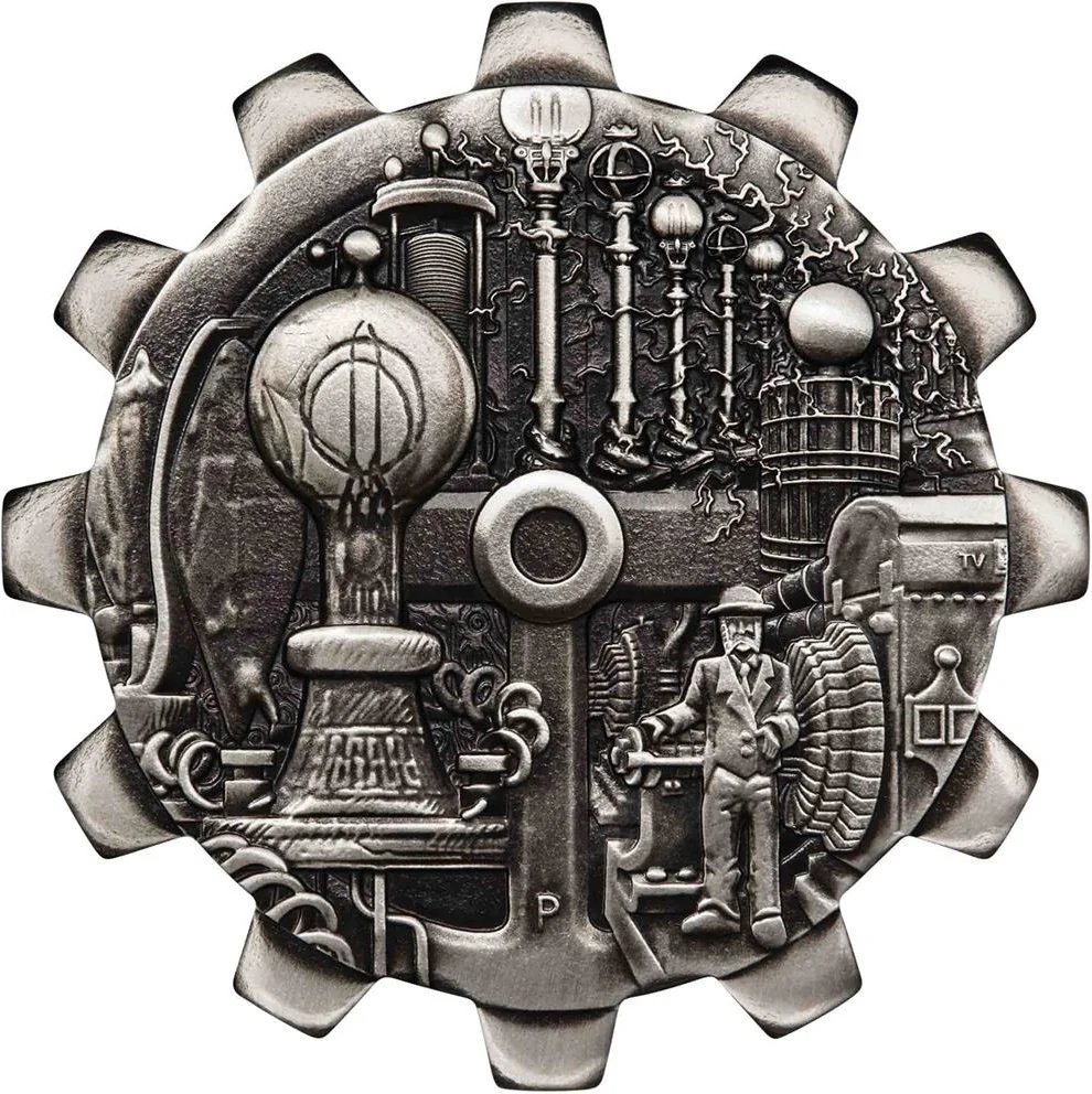 An image of Thomas Edison and his lightbulb at Pearl Street Station, alongside electrical discharges from a Tesla coil, a high-voltage system for wireless energy experiments.