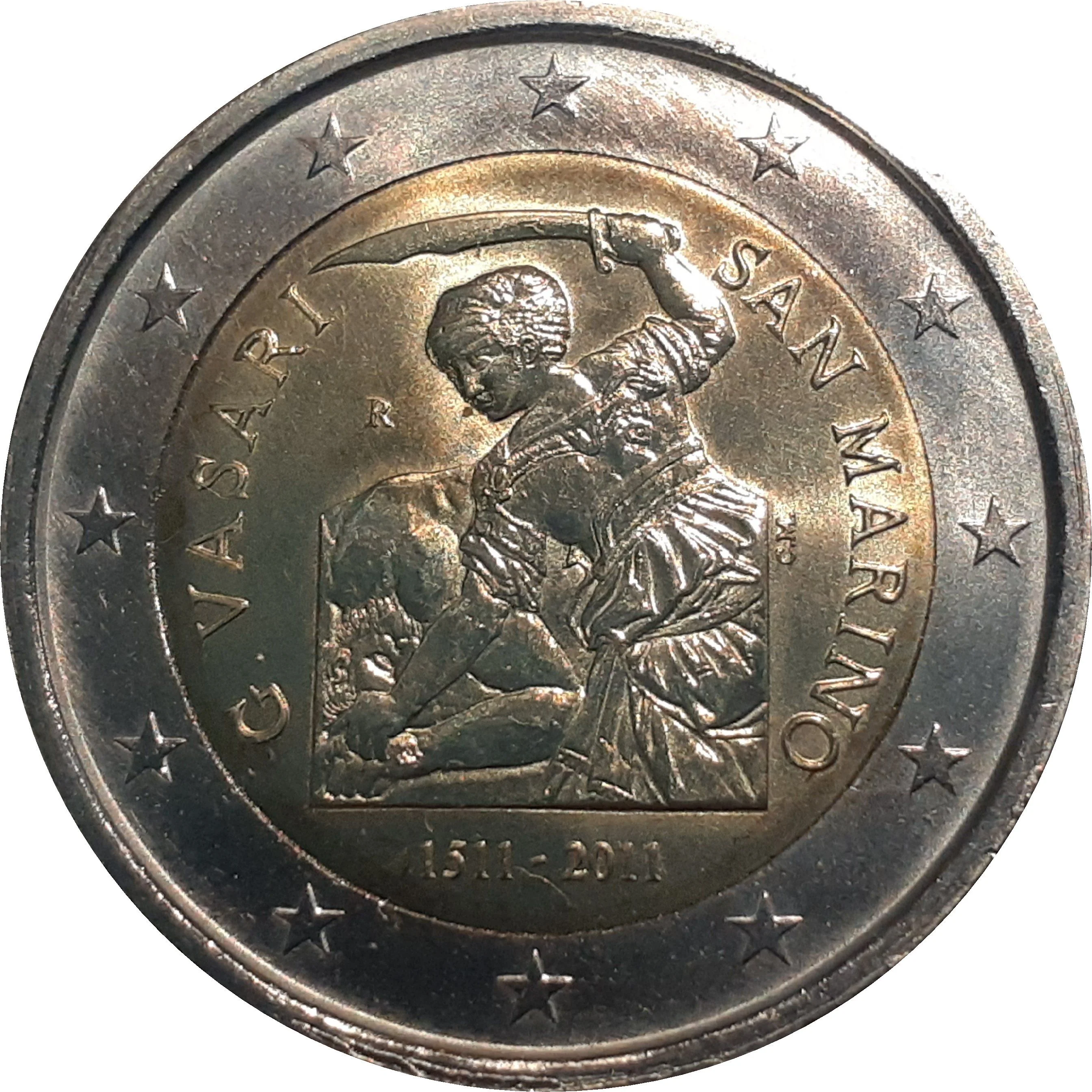 Description: The inner part of the coin marks the 500th anniversary of Giorgio Vasari's birth. It features a detail from his painting "Giuditta decapitates Oloferne". Centred at the bottom are the dates "1511-2011", with "G. VASARI" and "SAN MARINO" along the left and right edges. The mintmark "R" is to the left of the motif and the designer's initials "CM" are to the right. The outer ring depicts the 12 EU stars.