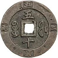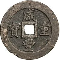 Description: Manchu words (vertical) flank the hole, each with one Chinese character above and below. Four Chinese characters are on the rim, read right-to-left and top-to-bottom.