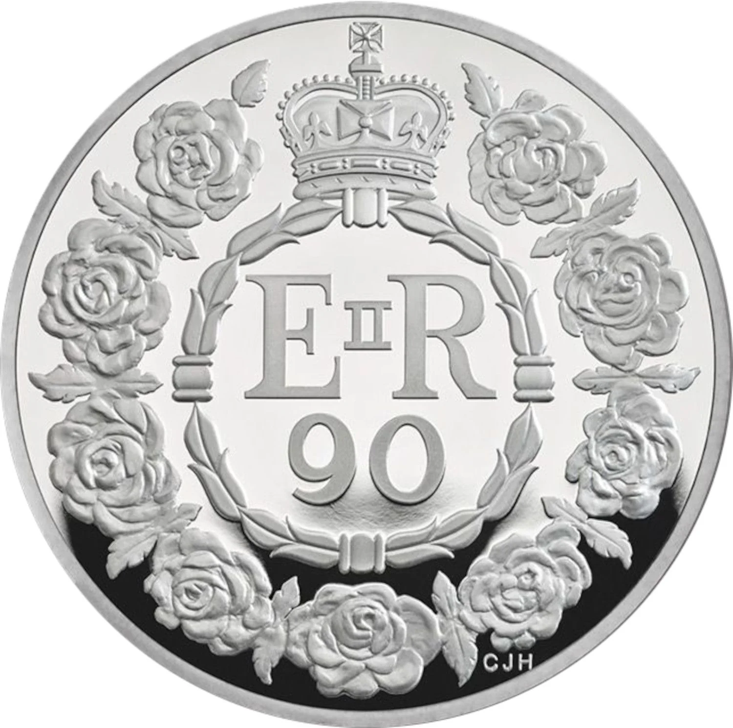 Crowned Royal Cypher above 90, encircled by nine roses.