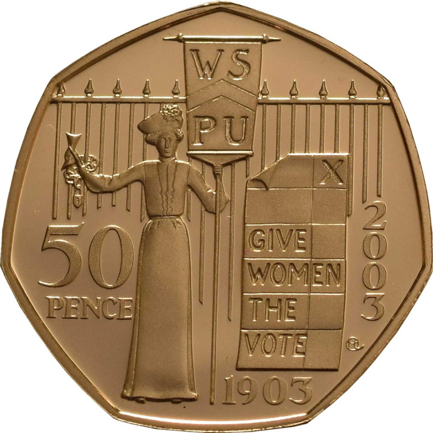 Suffragette figure chained to railings, holding a banner. A marked ballot is to the right, with the denomination left and commemorative dates right and below.