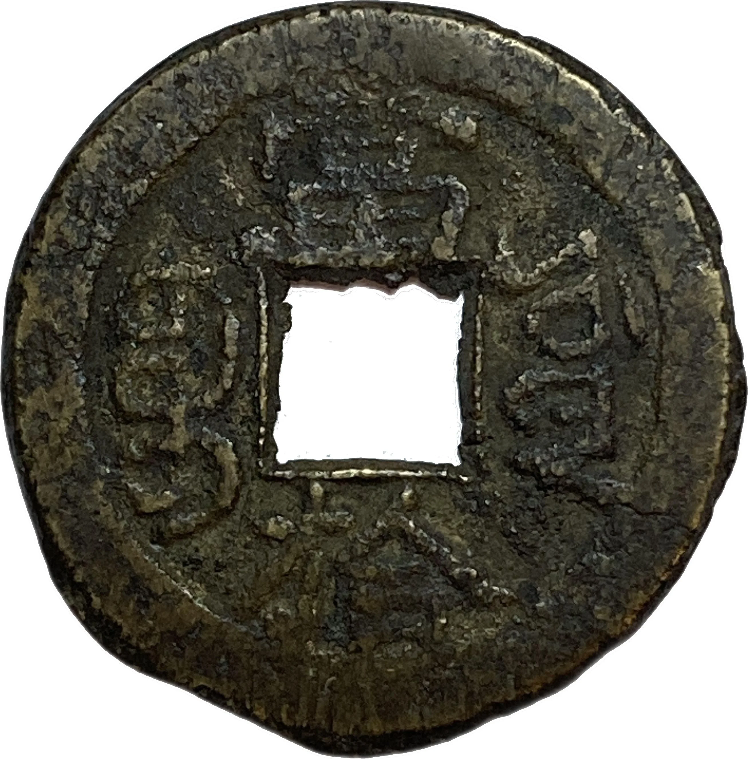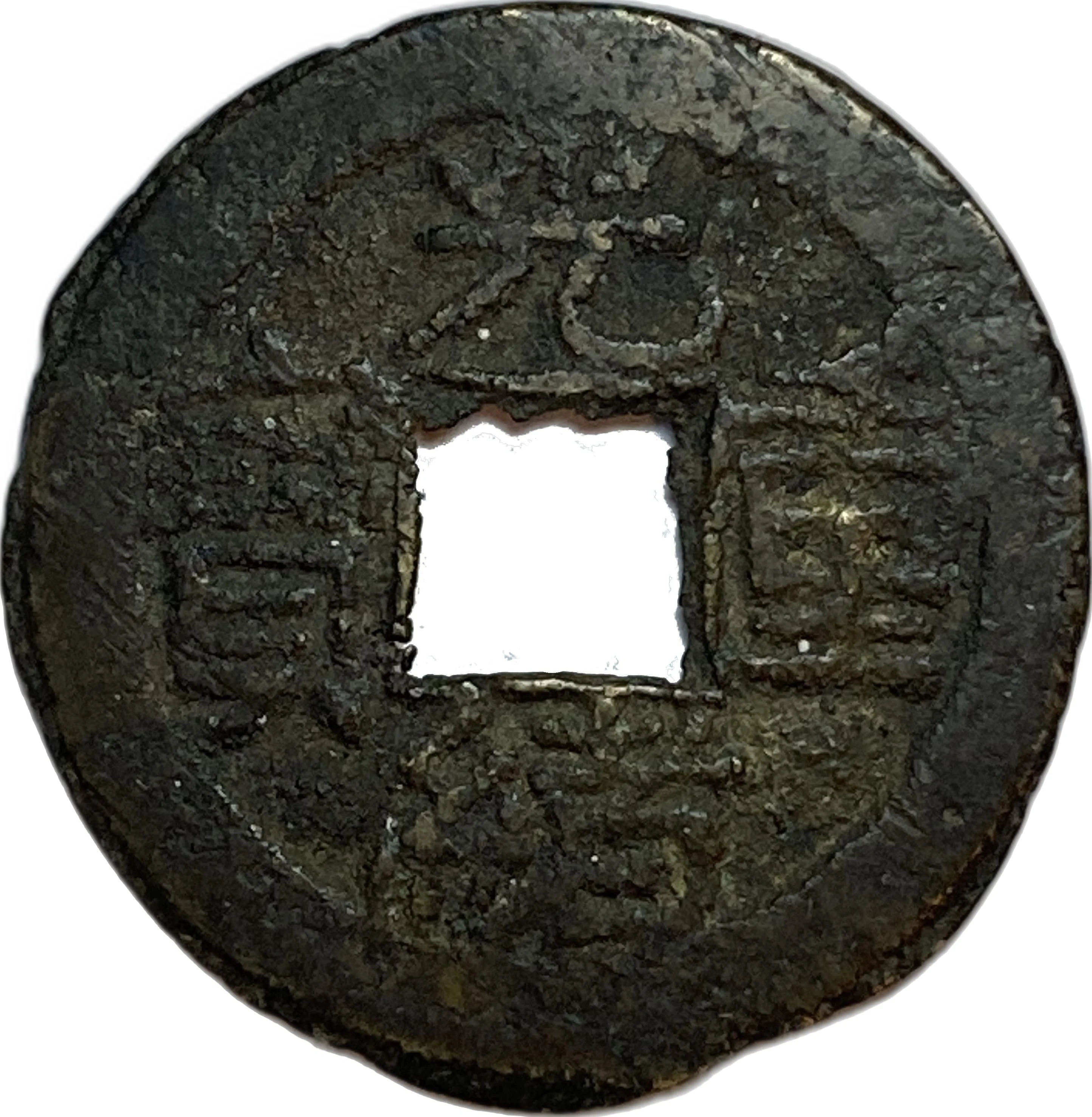 Two vertical Manchu words flank a central hole, each with a Chinese character above and below, and a dot at the upper left.