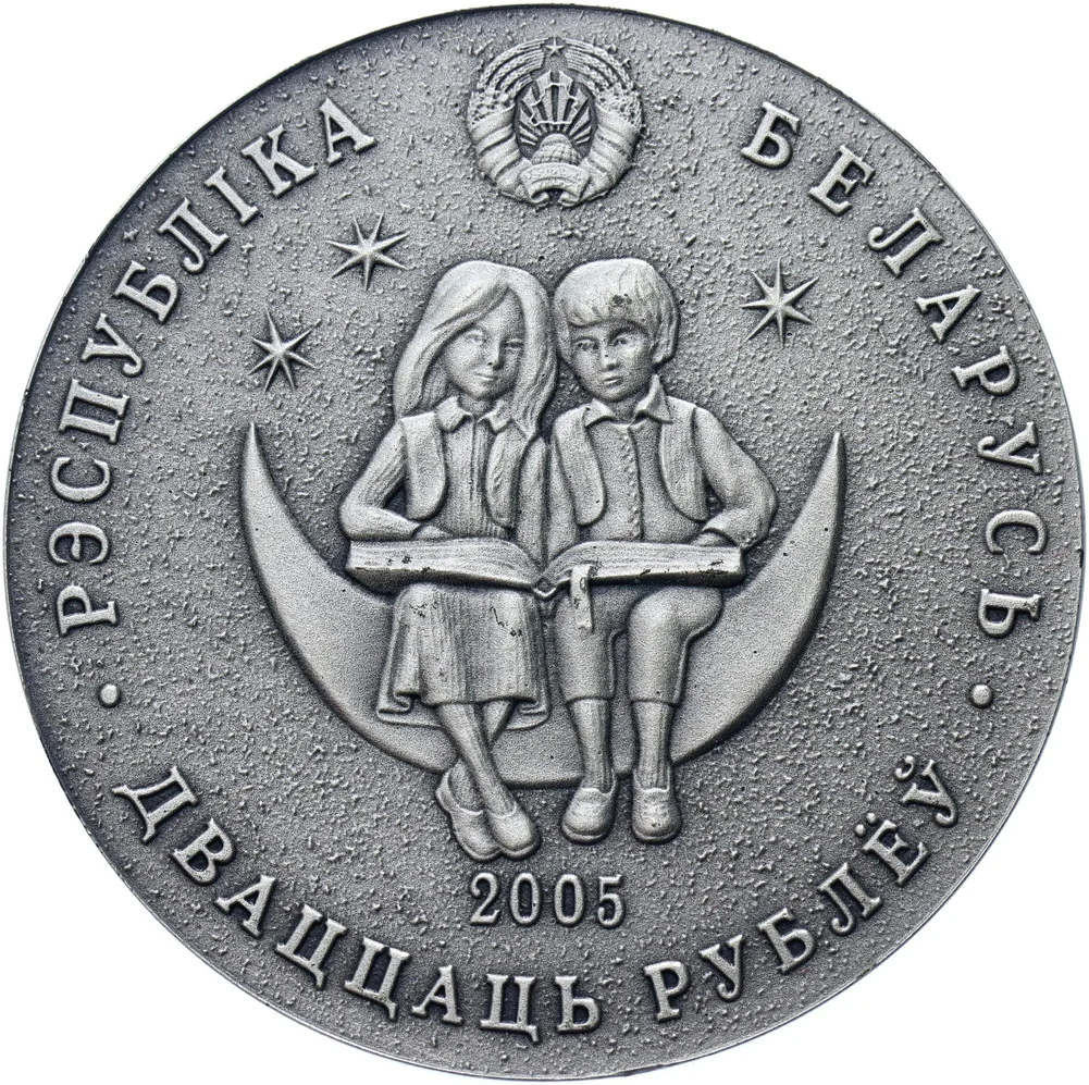 Description: Bottom: relief of the State Coat of Arms. Center: a boy and girl holding an open book against a starry sky. Below: year of issue. Rim inscriptions: top – "РЭСПУБЛIКА БЕЛАРУСЬ", bottom – "ДВАЦЦАЦЬ РУБЛЁЎ".