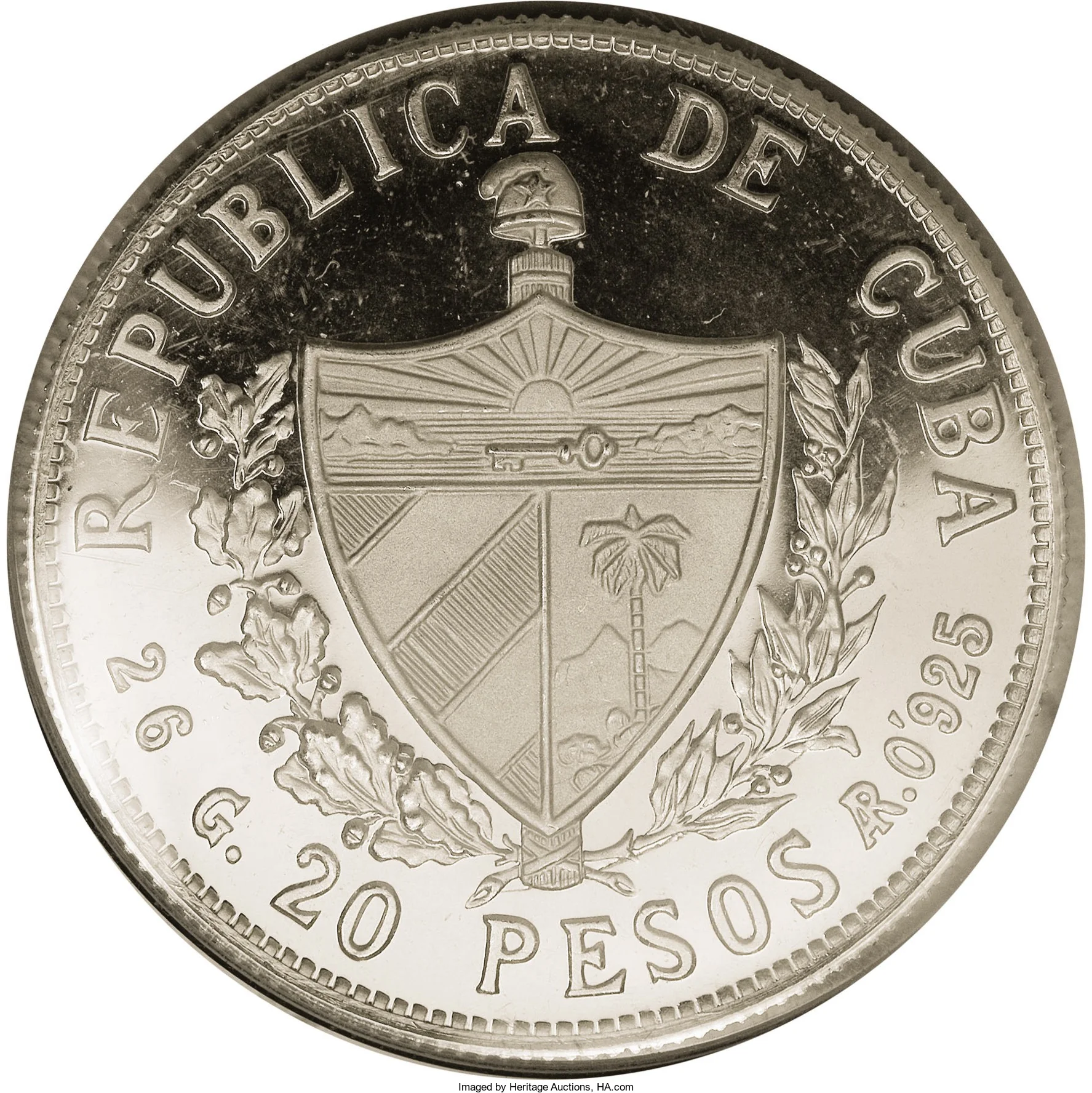 Cuban coat of arms with curved country name above, face value below, and weight and fineness on the sides.
