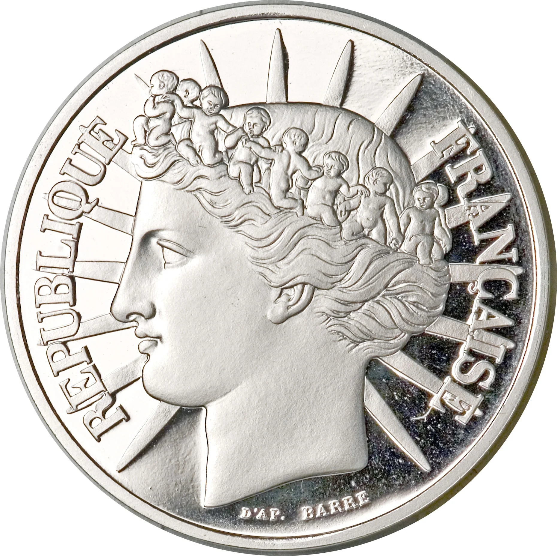 The left profile of an allegorical Republic, crowned with children after Barre's engraving, is encircled by "REPUBLIQUE FRANÇAISE".