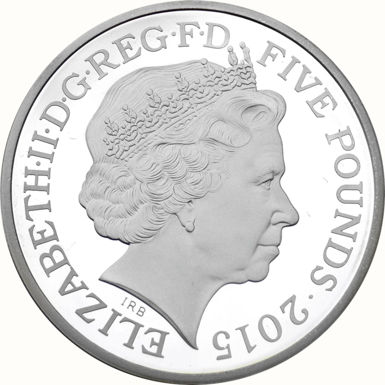 Elizabeth the Second, by the Grace of God, Queen, Defender of the Faith. Five Pounds 2015.