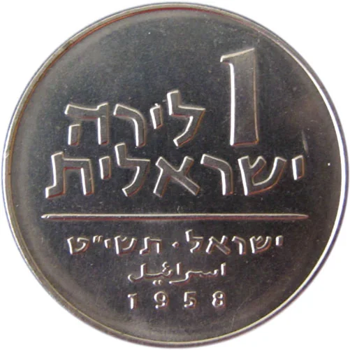 "1 Israeli Lira" in Hebrew. Below, "Israel" in Hebrew and Arabic, with the mint year 1958 (5719 in Hebrew).