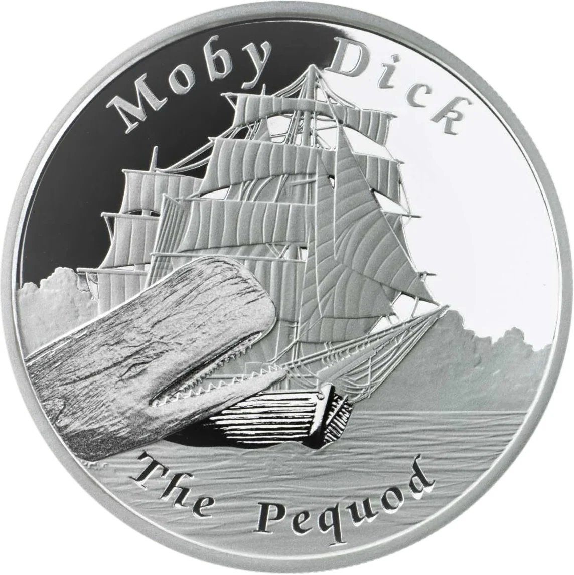 The Pequod under full sail as Moby Dick breaches before her.