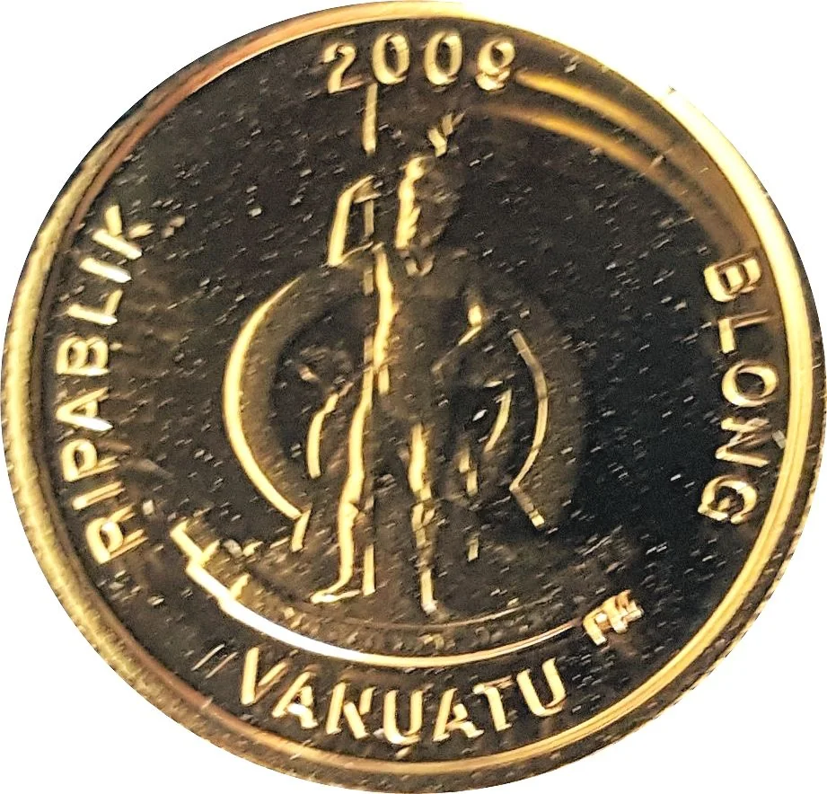 Description: Vanuatu's coat of arms depicts a Melanesian warrior before a boar's tusk, with the motto "LONG GOD YUMI STANAP" and the date below.