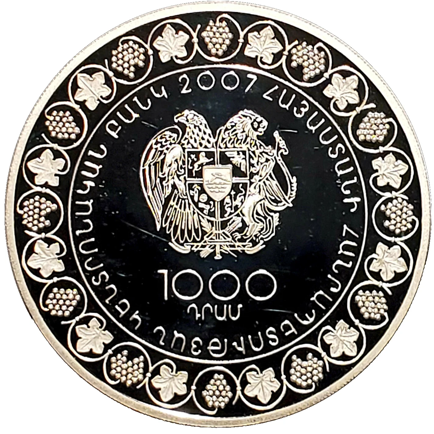 Armenian seal flanked by grape bunches and leaves, with year above and denomination below.