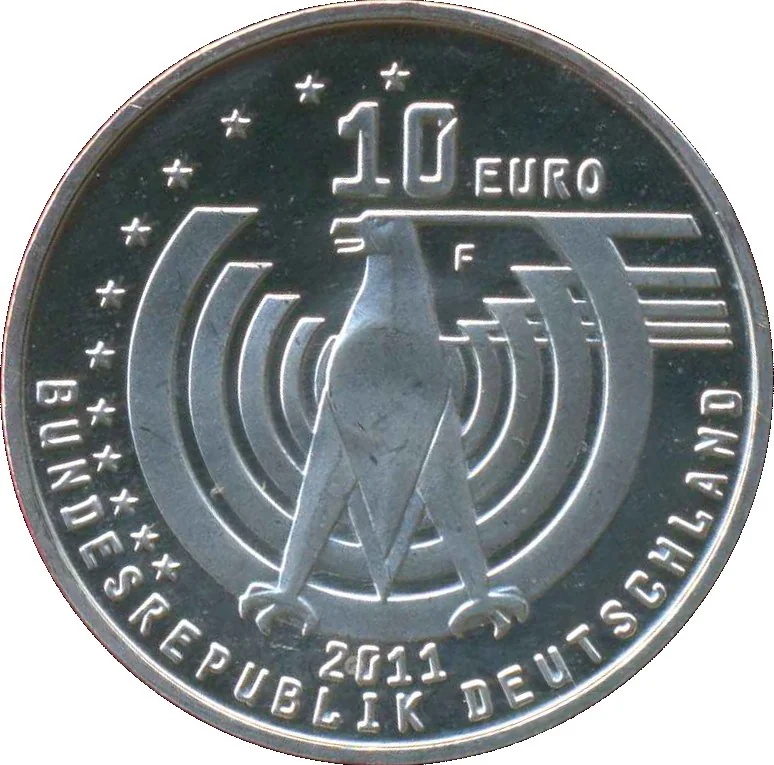 German heraldic eagle with denomination above, date below, country name at bottom, and EU stars to the left.