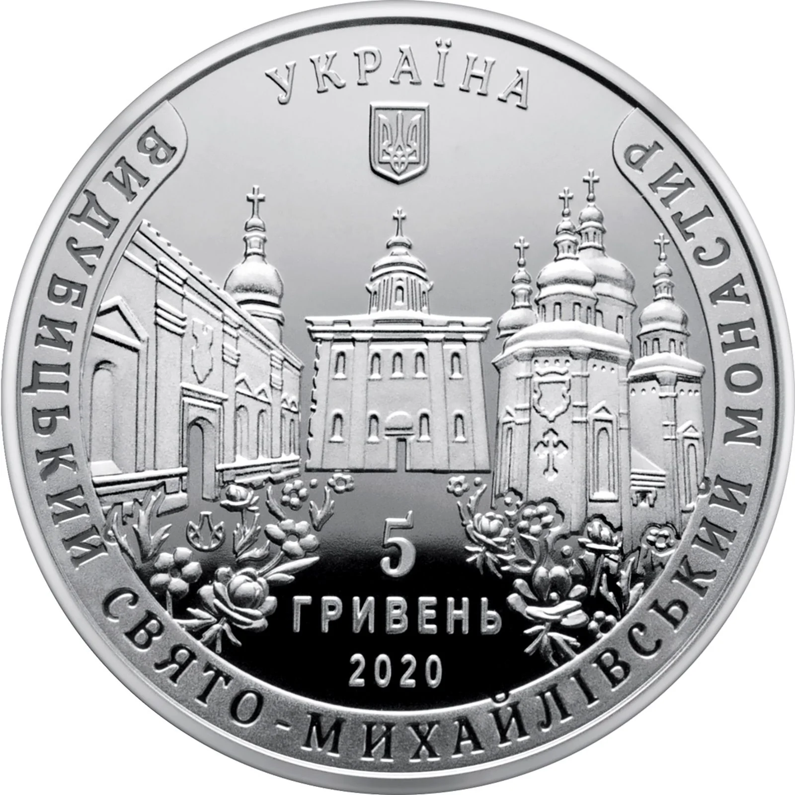 Description: The coin features Ukraine's small coat of arms and the word "УКРАЇНА" at the top. The central design shows buildings from the Vydubychi Monastery complex, with the inscriptions "5 ГРИВЕНЬ 2020" below and "ВИДУБИЦЬКИЙ СВЯТО-МИХАЙЛІВСЬКИЙ МОНАСТИР" above. The mint mark is placed among the flowers to the left.