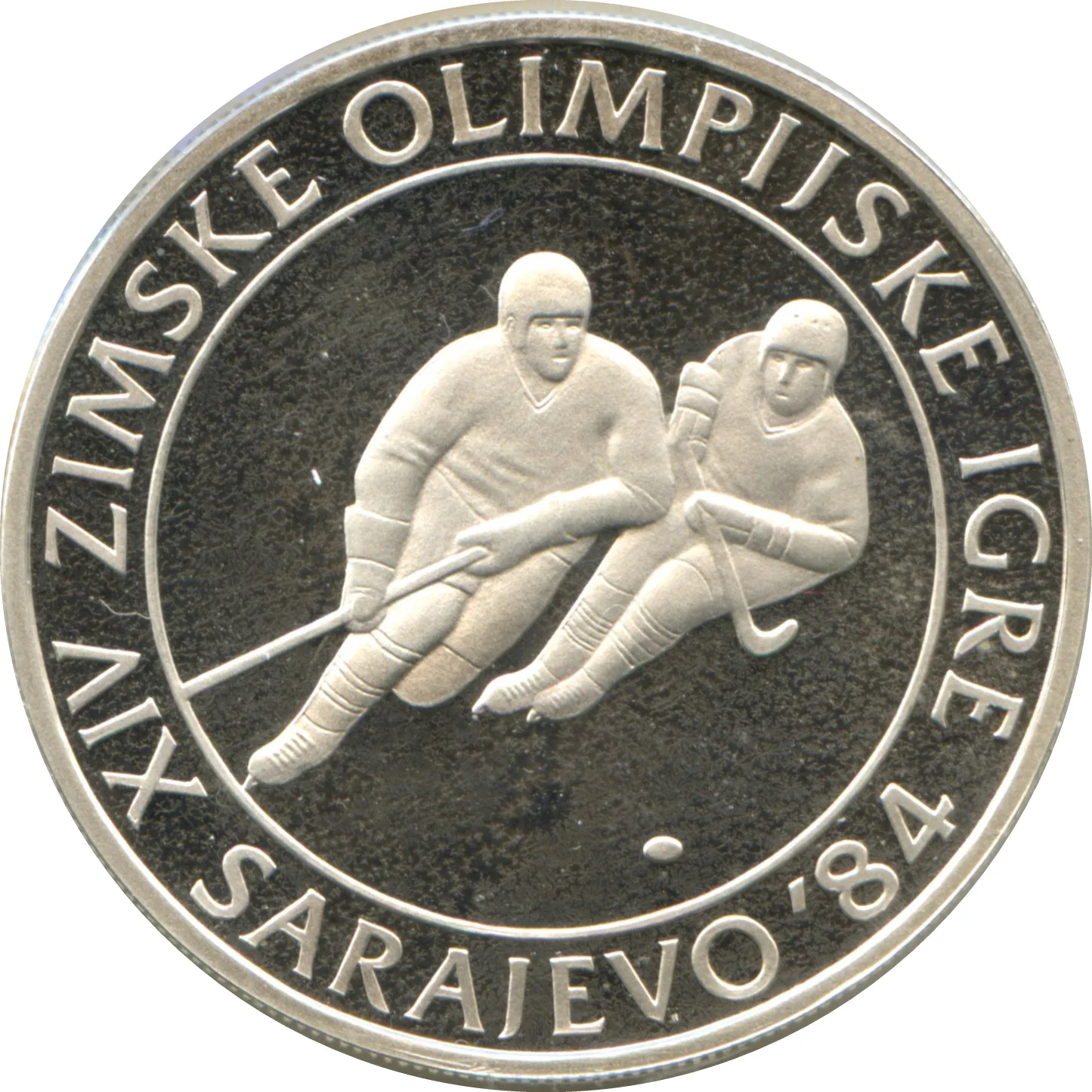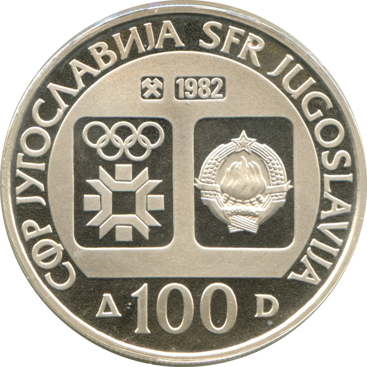 Olympic logo above Sarajevo 1984 logo and SFRY coat of arms in side shields, within a flat-bottomed circle. Denomination below.