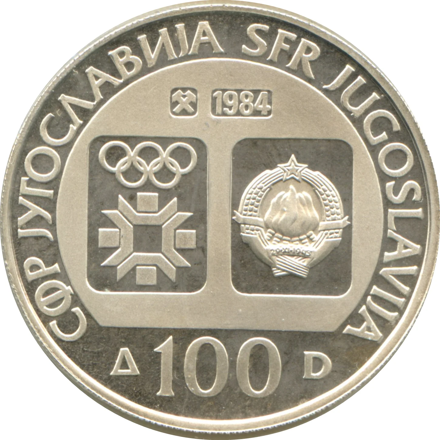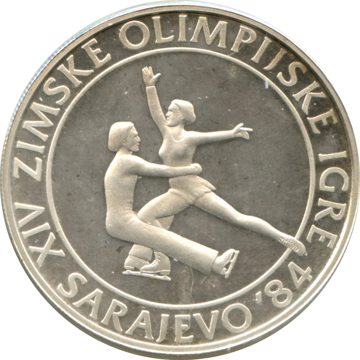 Description: Olympic logo above Sarajevo 1984 logo and SFRY coat of arms in side shields, within a flat-bottomed circle. Denomination below.