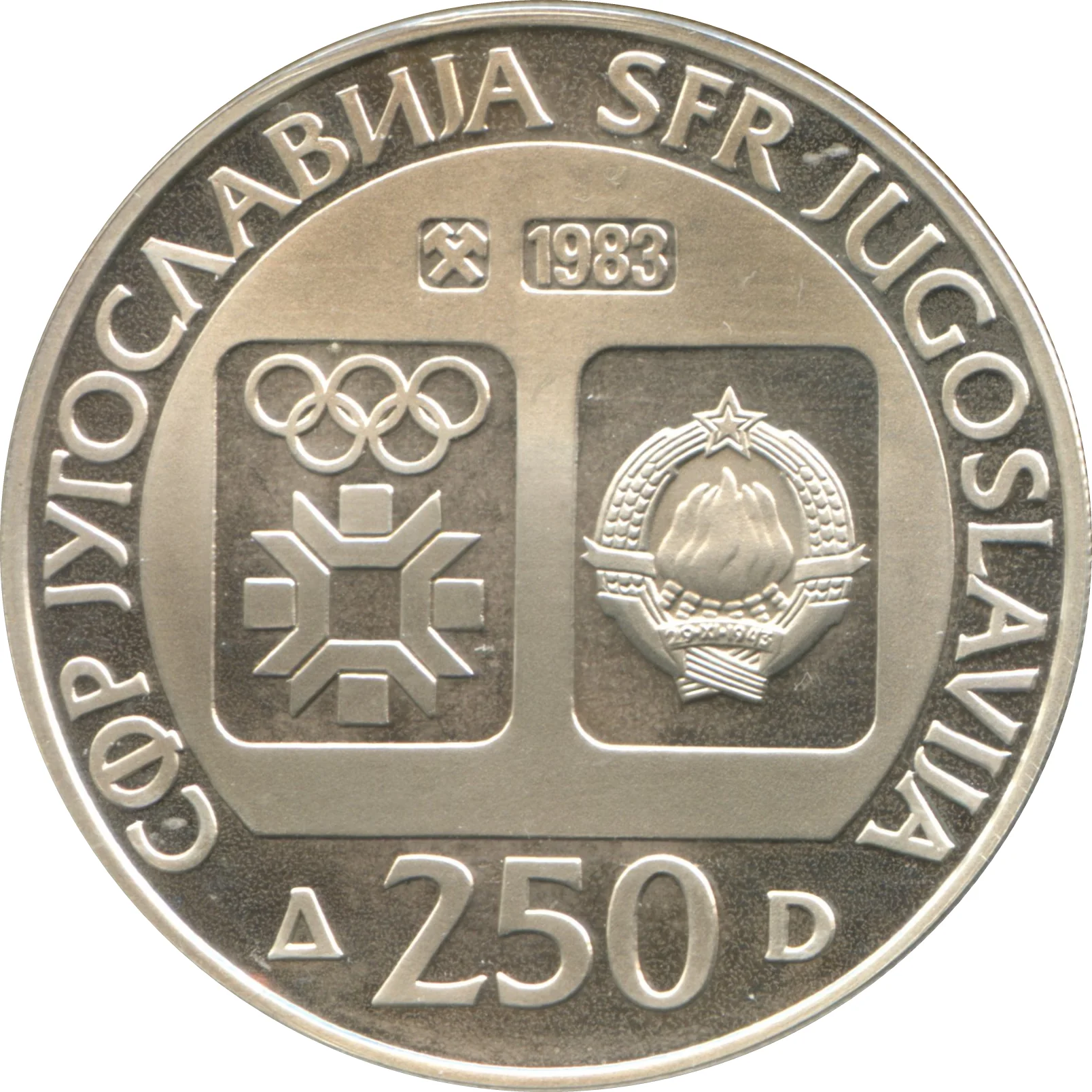 Olympic logo above Sarajevo 1984 logo and SFRY coat of arms in side shields, within a flat-bottomed circle. Denomination below.
