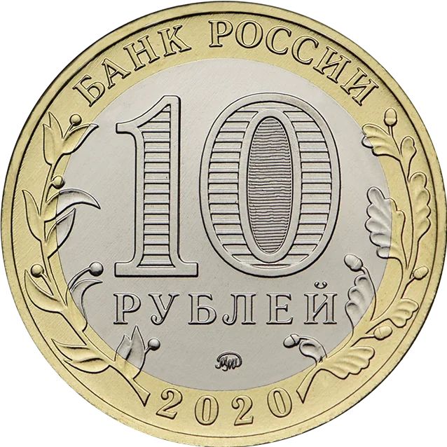 The central disc features "10 РУБЛЕЙ" with a "0" containing hidden images of "10" and "РУБ" visible at different angles, and the mint mark below. The ring bears "БАНК РОССИИ" above, "2020" below, and stylized plant twigs extending onto the disc on the sides.
