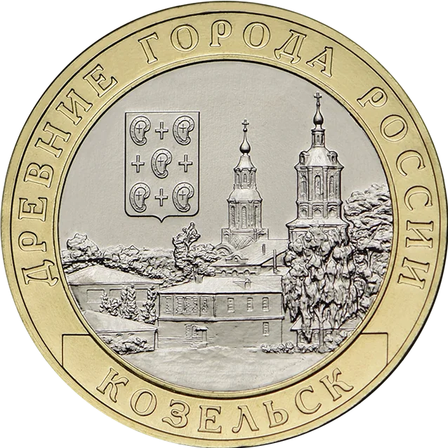The coin features the Nikolskaya Church, the municipal arms of Kozelsk, and the inscriptions "ДРЕВНИЕ ГОРОДА РОССИИ" (ANCIENT TOWNS OF RUSSIA) and "КОЗЕЛЬСК" (KOZELSK).