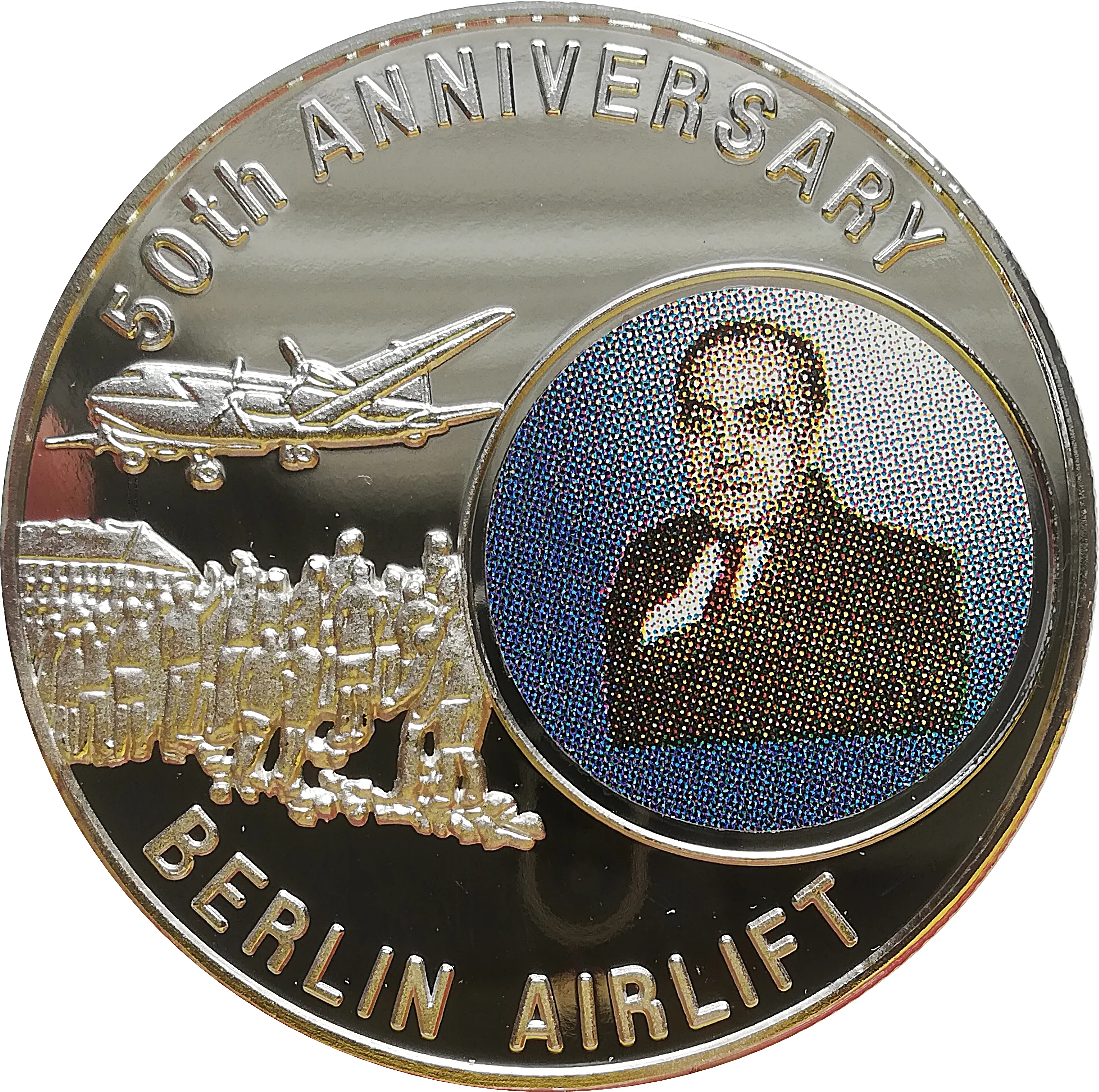 West Berliners watch aircraft; inset, Ernst Reuter's coloured bust.