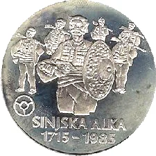 Yugoslav coat of arms, denomination, and date, with a scene of Sinj's tournament featuring its buildings and participants.