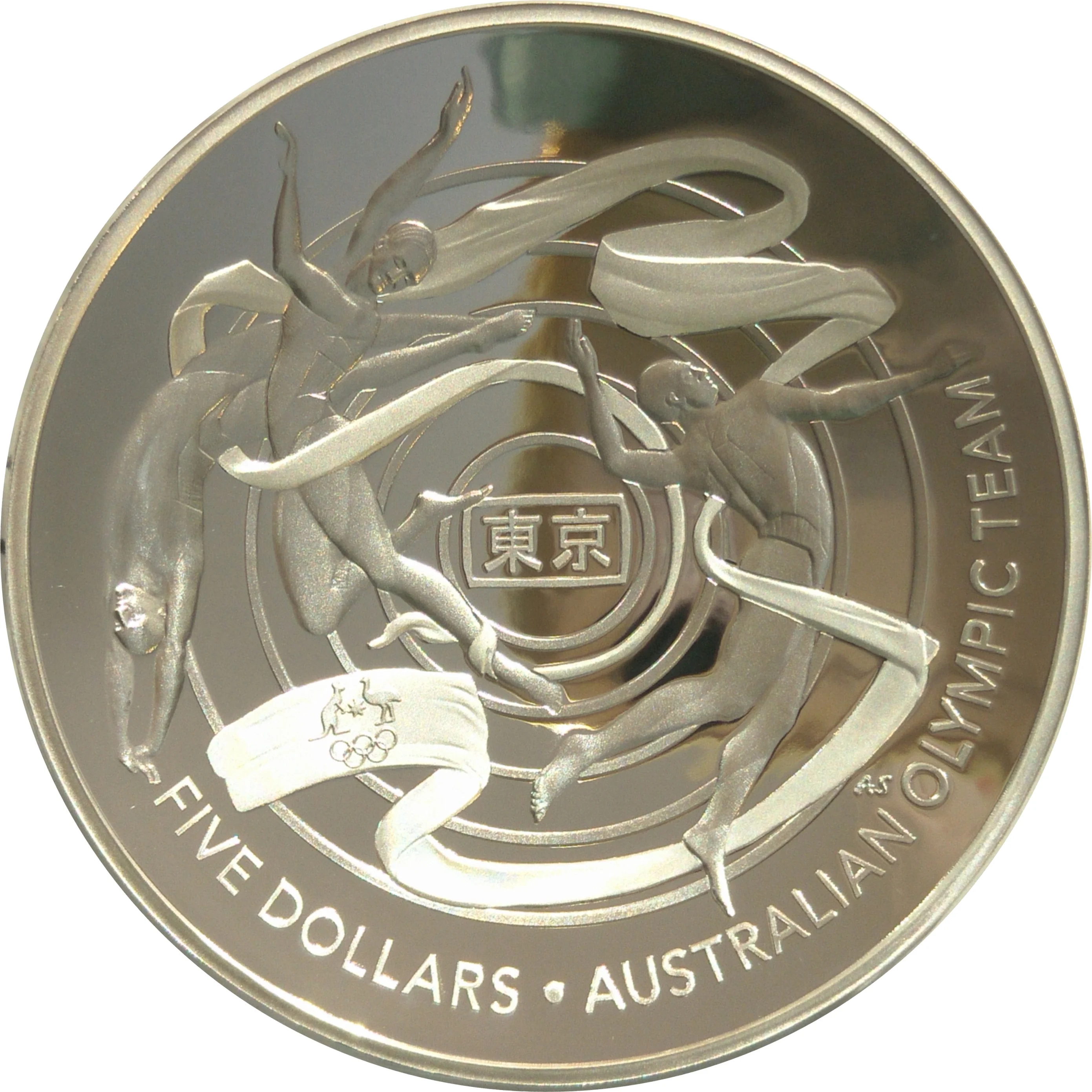 Three athletes with ribbons, Australian Olympic logo, two Japanese characters at centre.