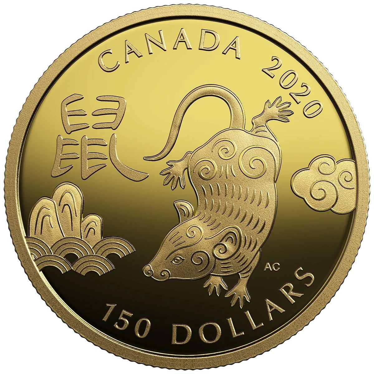 Canadian artist Aries Cheung depicts an exploring Rat, poised between lucky waves and auspicious clouds. Their swirling forms are echoed in the Rat's fur, bestowing fortune. The Chinese character for "Rat" is engraved above.