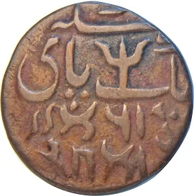 Persian: Yek pai sikka. Devanagari: Ek pai sikka. Features a trident and Persian inscription.
