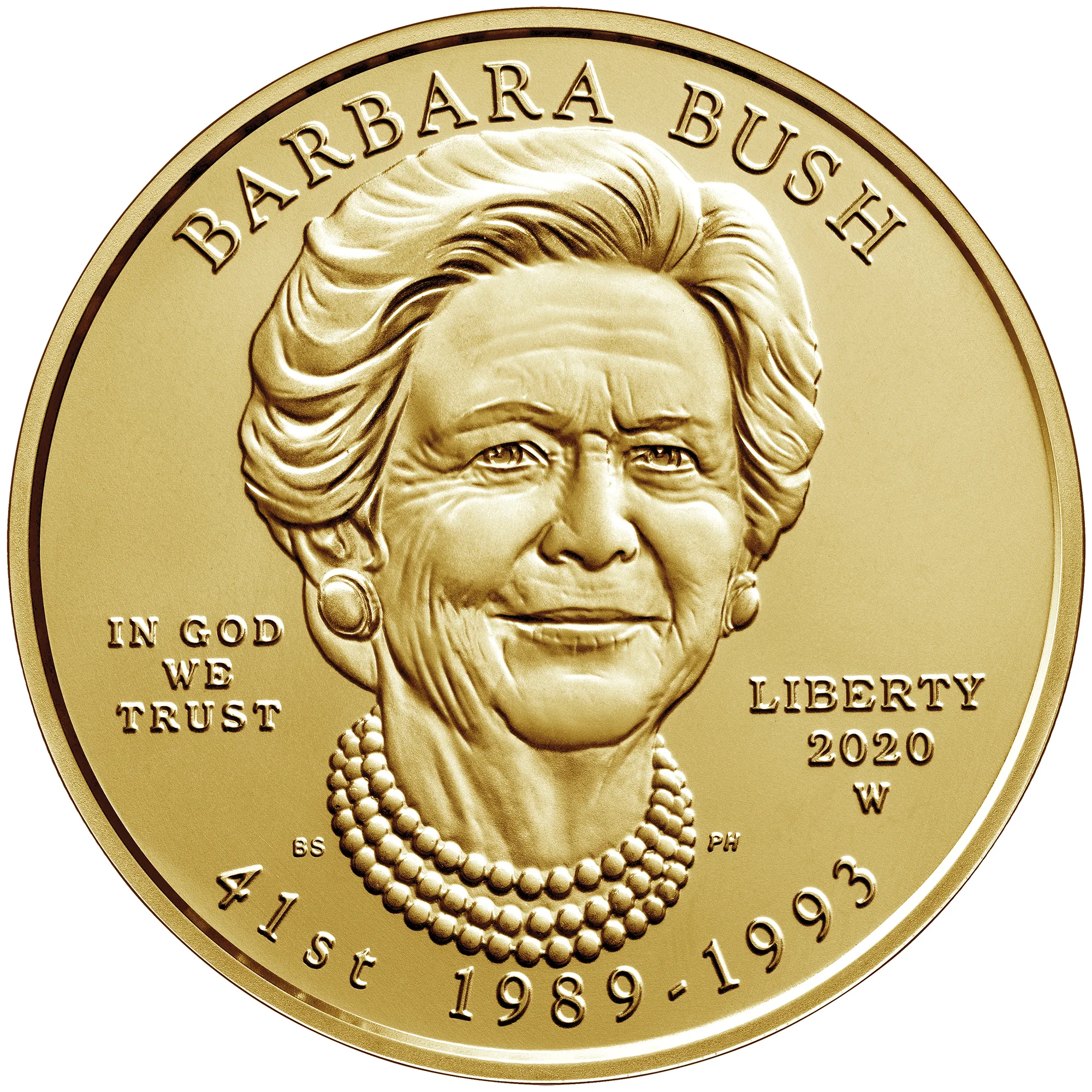 Honoring Mrs. Bush's literacy advocacy, this design shows a person reading. The open book symbolizes knowledge, the road ahead the journey of life, and the distant sun a brighter future.