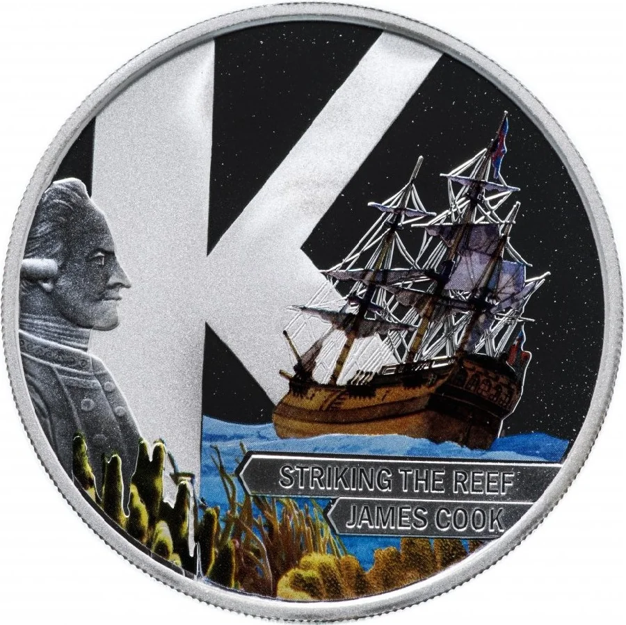 A "K" with Captain Cook's ship wrecking on a reef behind it.