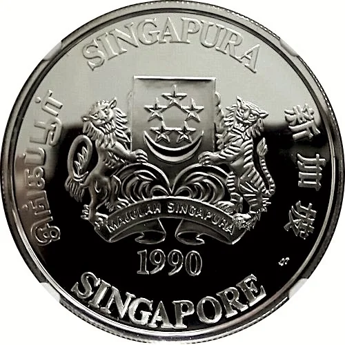 The obverse shows Singapore's coat of arms with the issue year below. The word "SINGAPORE" appears along the border in the four official languages: Malay, Mandarin, English, and Tamil.