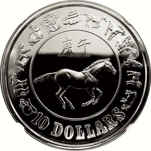 The reverse shows a galloping horse within a circle, surrounded by lunar animals, with "10 DOLLARS" below.