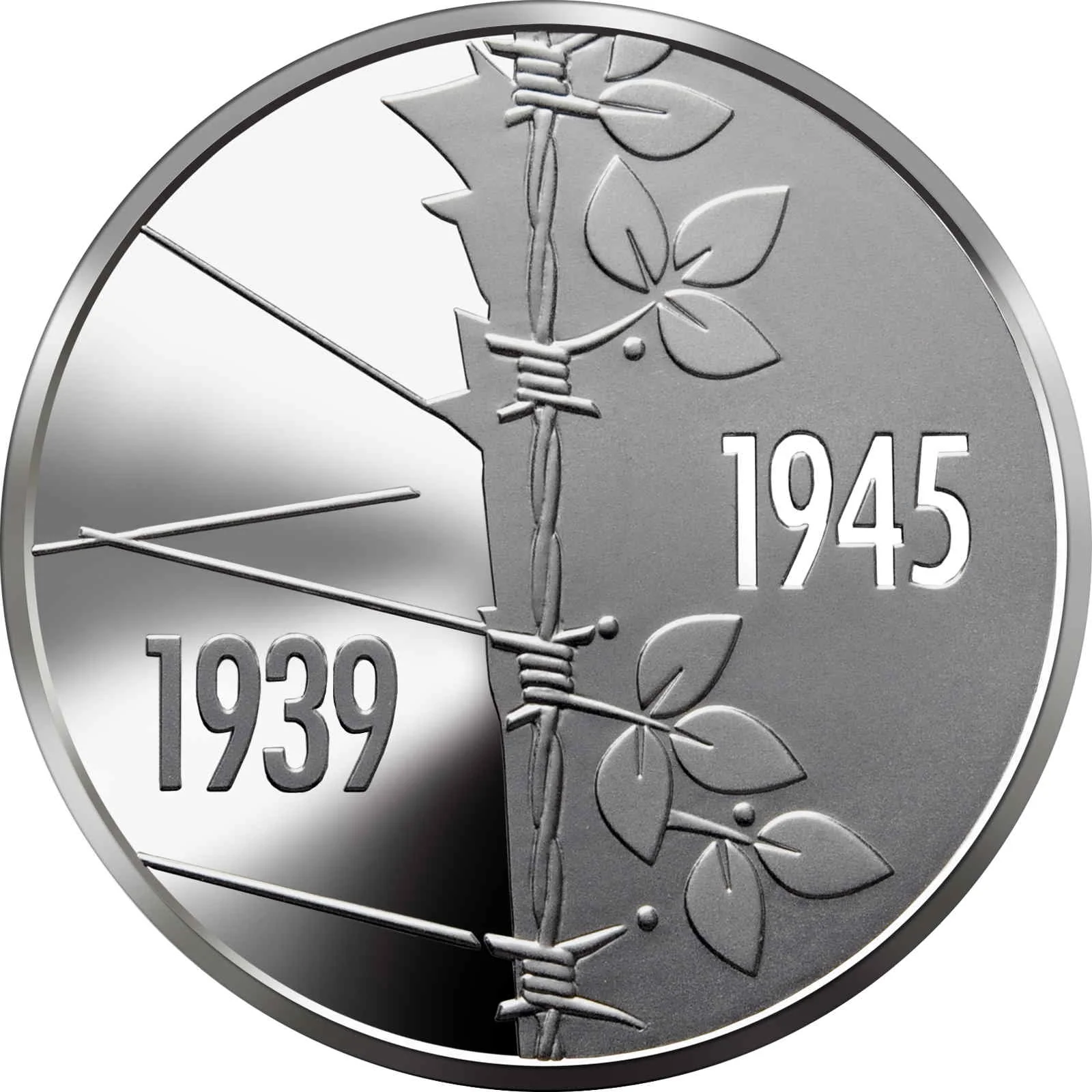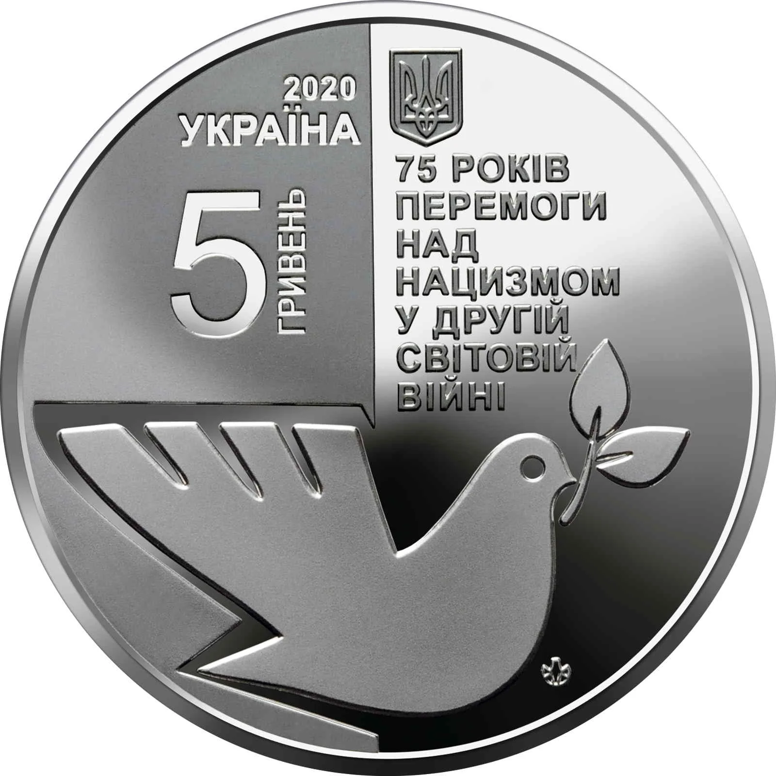 Description: Against a smooth background, Ukraine's small coat of arms is above the central inscription: "75 РОКІВ ПЕРЕМОГИ НАД НАЦИЗМОМ У ДРУГІЙ СВІТОВІЙ ВІЙНІ". To the left, on a matt backdrop, are "2020", "УКРАЇНА", and a vertical "5 ГРИВЕНЬ". Below, a dove with an olive branch symbolizes peace and victory. The NBU mint mark is at the bottom right.