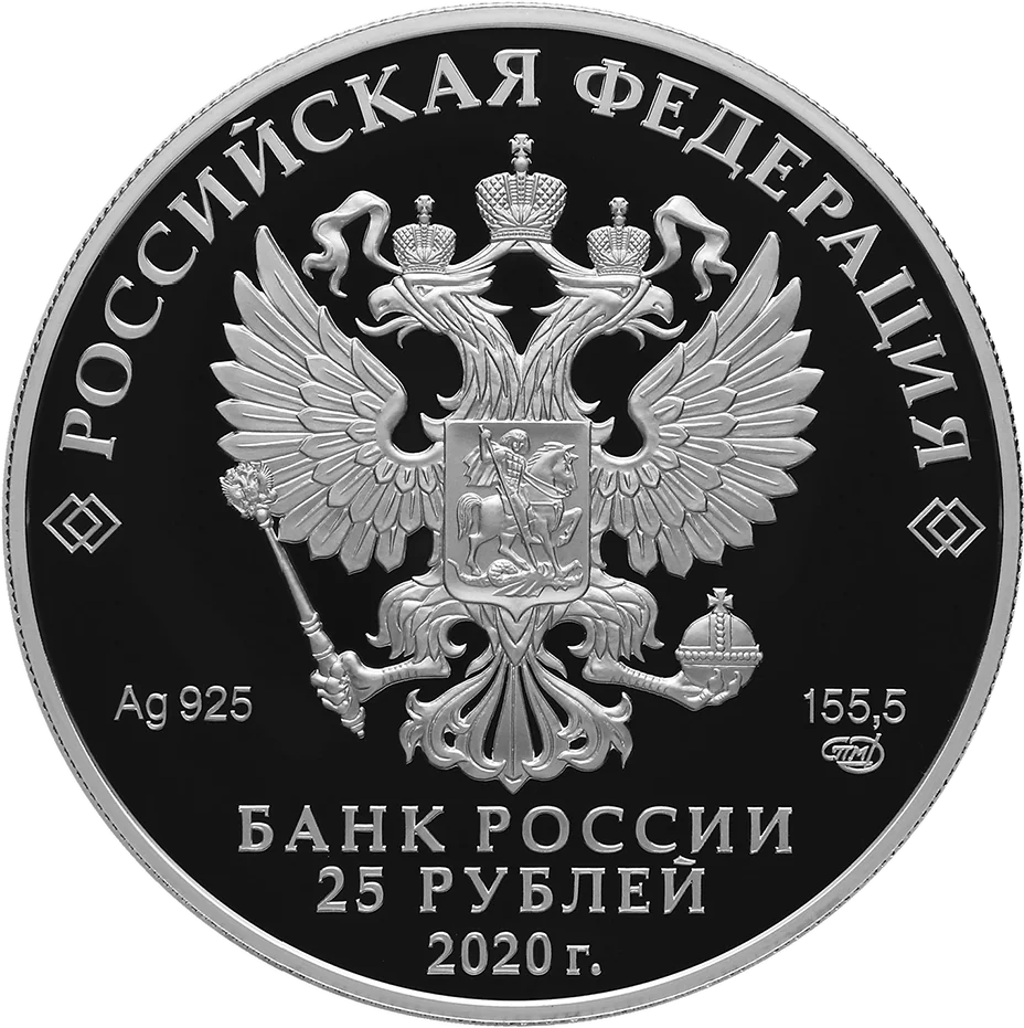 The obverse features the State Coat of Arms of the Russian Federation, inscriptions for "RUSSIAN FEDERATION," "BANK OF RUSSIA," "25 ROUBLES," "2020," metal specifications, the mint mark, and fine metal content.
