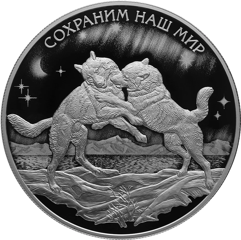 The disc's mirror field features two tundra wolves amid a landscape of water, rocks, and a starry sky, encircled by the inscription "СОХРАНИМ НАШ МИР" (PROTECT OUR WORLD).