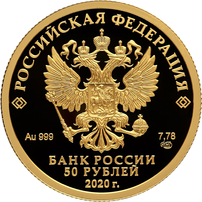 The disc's mirror field features the Russian Federation coat of arms. Above it, along the rim, is the semicircular inscription "РОССИЙСКАЯ ФЕДЕРАЦИЯ," flanked by doubled rhombuses. Below the coat of arms are the metal/fineness on the left and the fine metal content/mint mark on the right. Centered at the bottom, in three lines, are the inscriptions "БАНК РОССИИ," the denomination, and the year "2020 г."