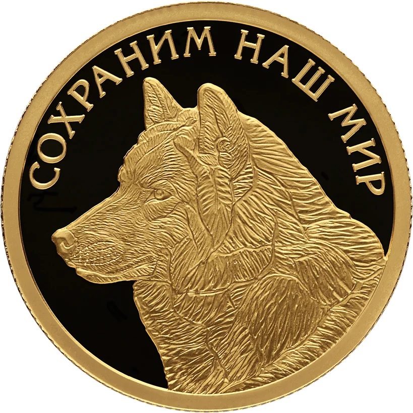 The disc's mirror field features a relief of a tundra wolf, with the inscription "СОХРАНИМ НАШ МИР" (PROTECT OUR WORLD) above along the rim.