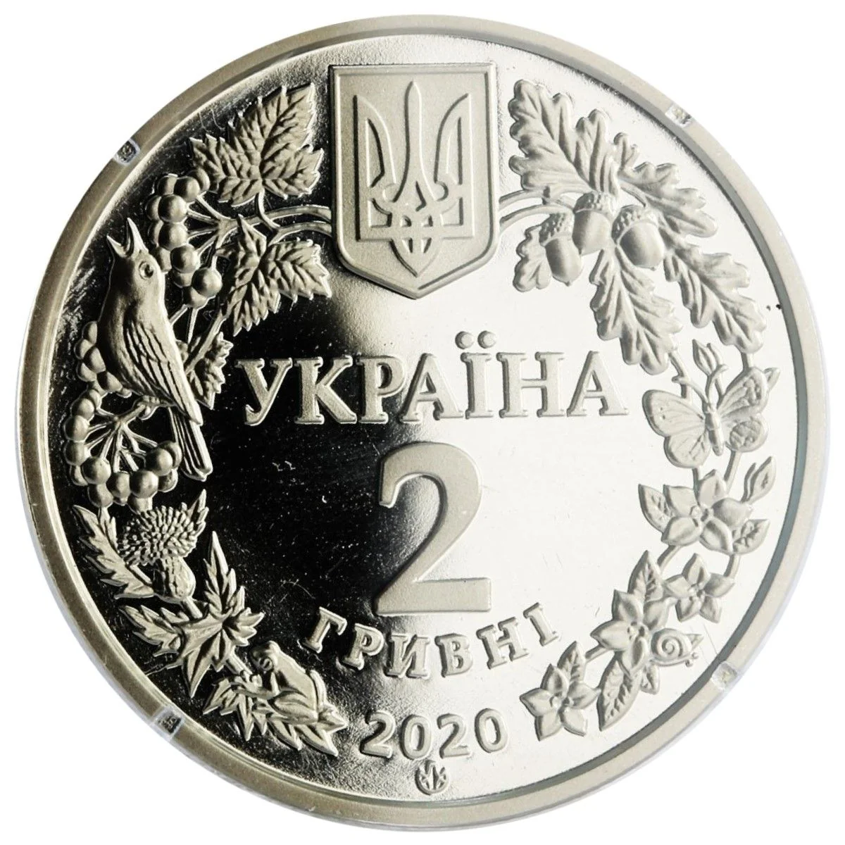 Ukraine's small coat of arms, flora, fauna, and the inscriptions УКРАЇНА/2/ГРИВНІ/2020 and the NBU mint mark adorn the wreath.