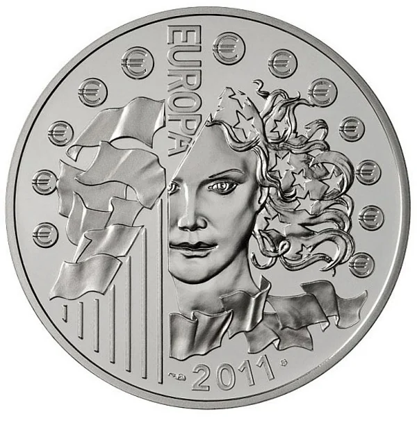 Portrait of Europa with stars in her hair, above an arc of 12 "€" symbols. To her left, European flags on mats.