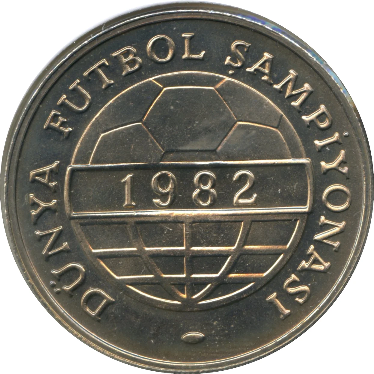Globe with latitude/longitude lines below, a football above, and "1982" in the center.