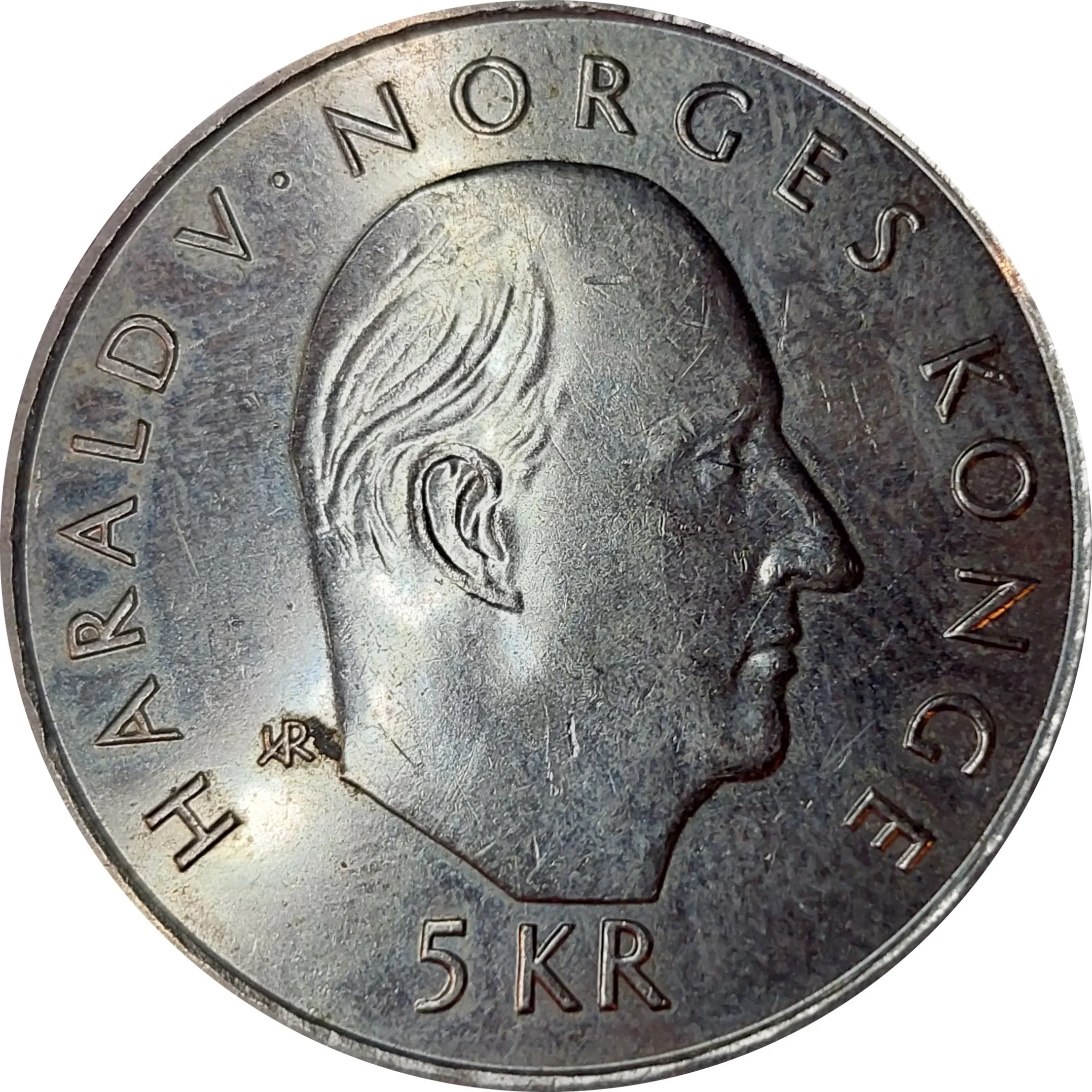 King Harald V bust facing right. Engraver's initials behind bust. Inscription surrounds. Value below. Solid rim ring.