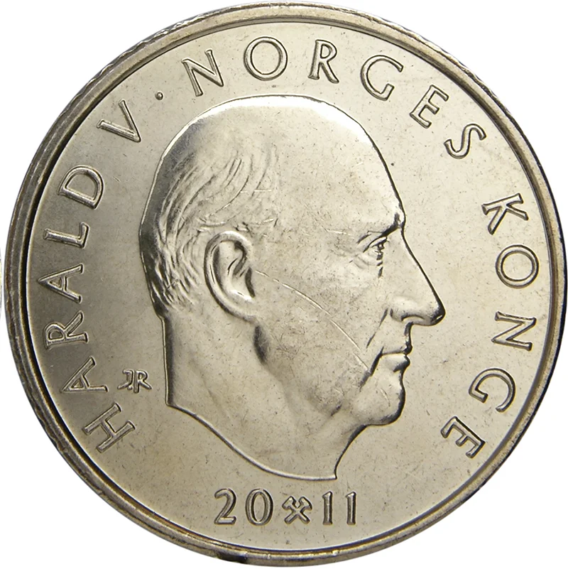 King Harald V bust facing right. Engraver's initials behind bust. Inscription surrounds. Date split by mintmark below. Solid rim ring.