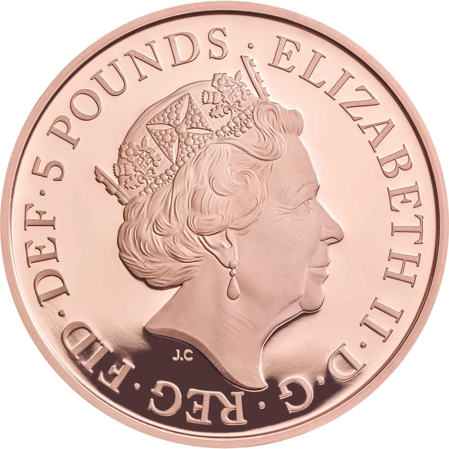 Elizabeth II, by the Grace of God, Queen, Defender of the Faith, 5 Pounds.