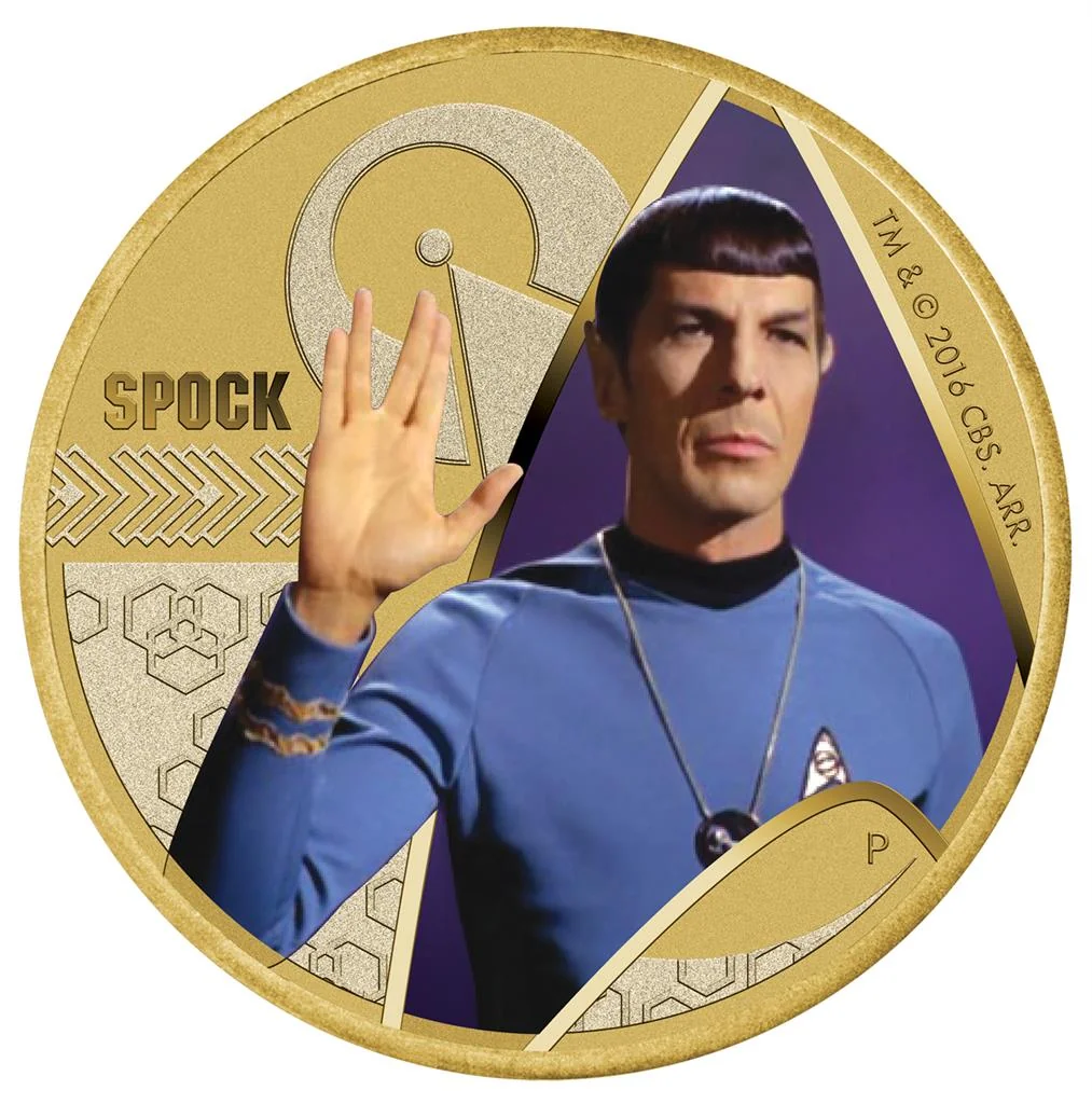 Leonard Nimoy as Spock giving the Vulcan salute, with the IDIC symbol behind him.