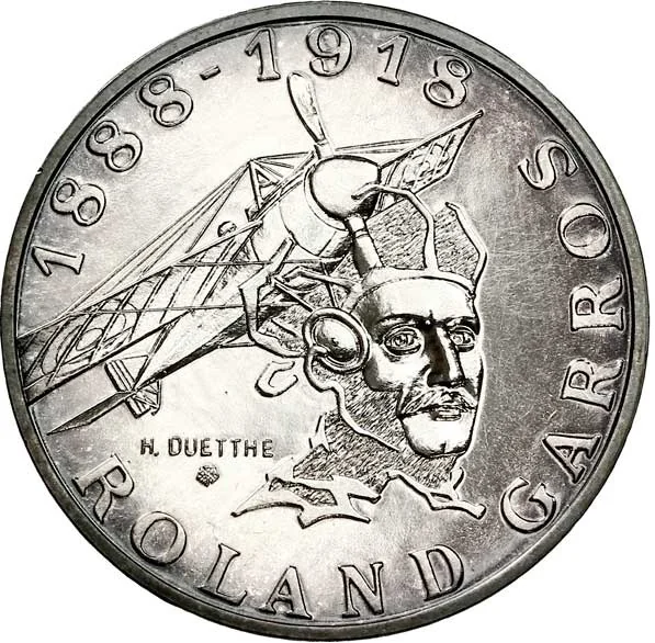 Circular "ROLAND GARROS 1888 - 1918" legend. Center: a Morane-Saulnier N aircraft and Roland Garros bust. Signature "H. DUETTHE" below.