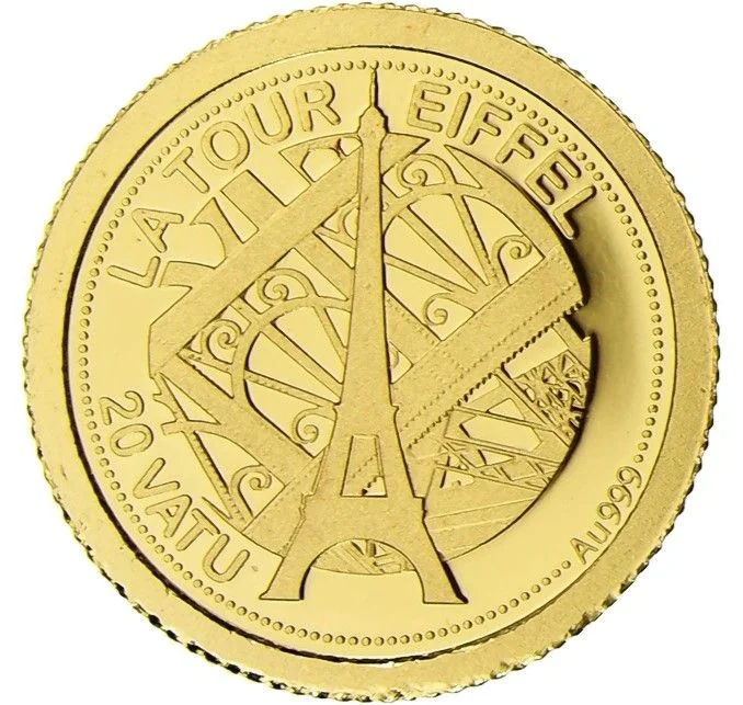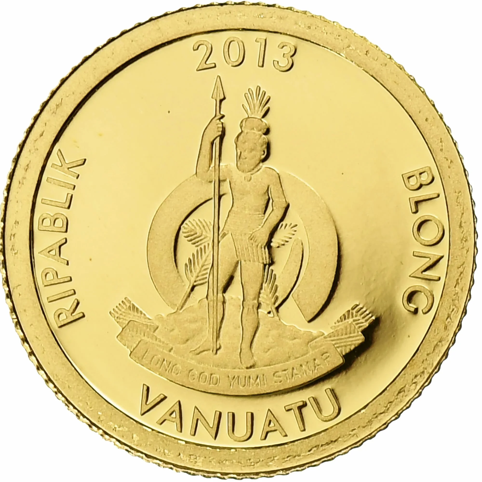 Vanuatu's arms depict a Melanesian warrior before a curved boar's tooth, a scroll reading "LONG GOD YUMI STANAP," and the date.