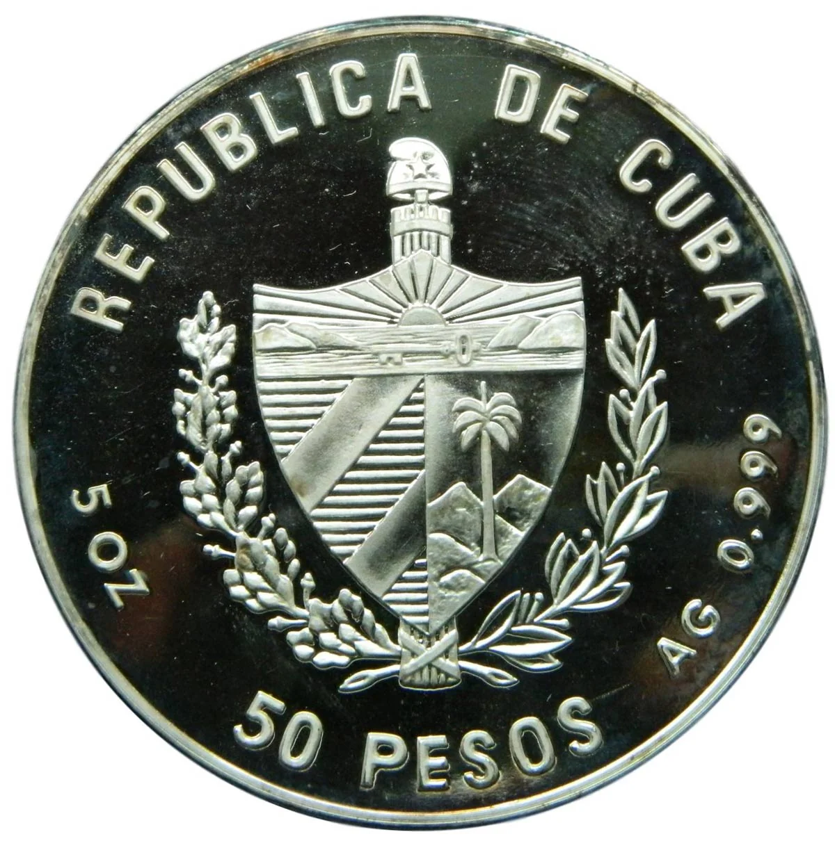Cuban coat of arms with country name above, face value below, and weight/fineness on the sides.