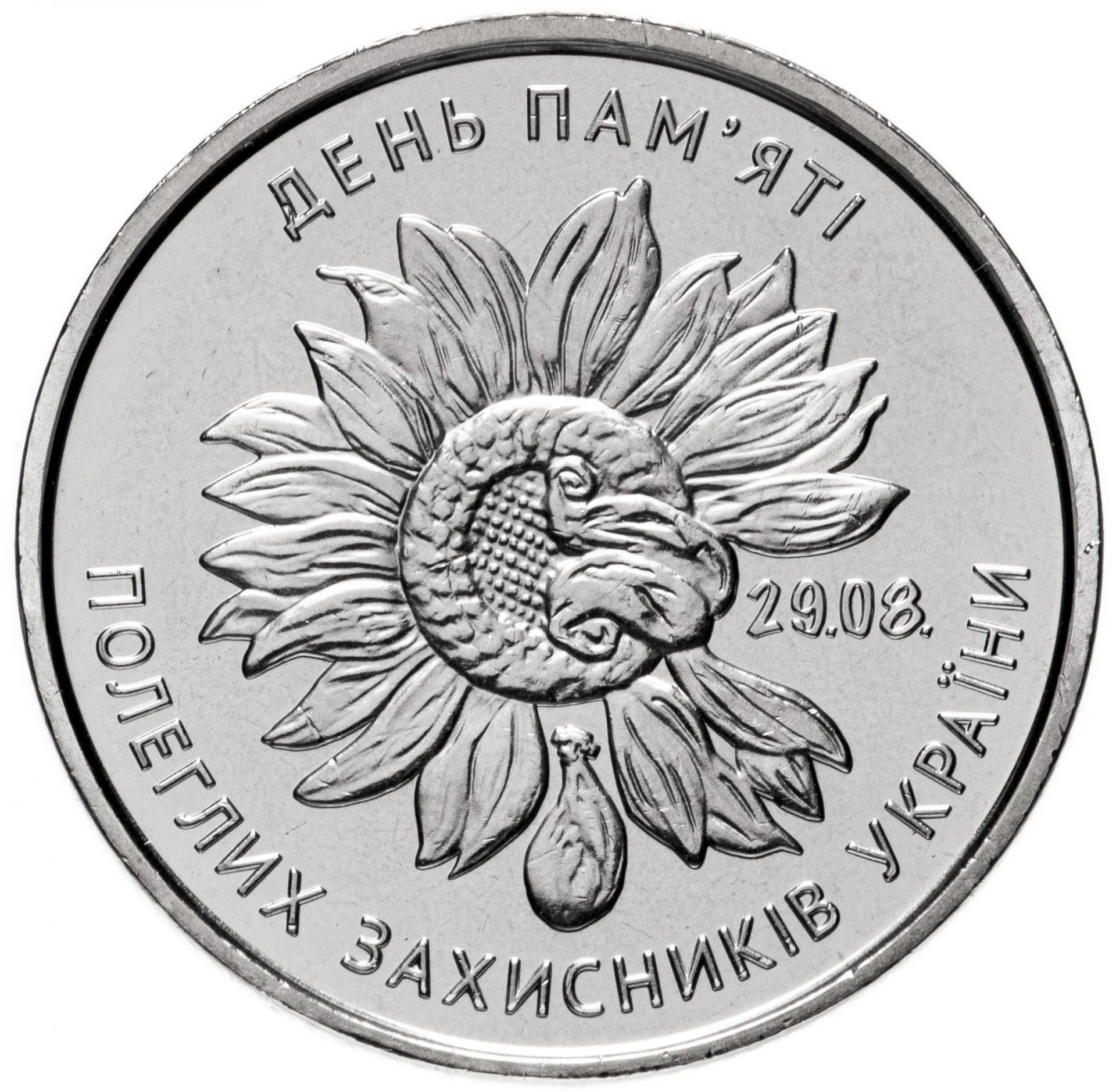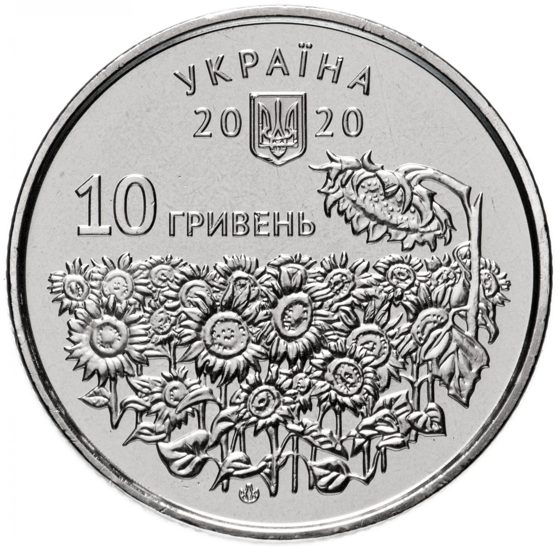Description: Above is the semicircular inscription "УКРАЇНА" and Ukraine's small coat of arms, flanked by the year 2020. Below left is the face value "10 ГРИВЕНЬ." The central allegorical composition shows a field of sunflowers, a traditional Ukrainian symbol of warmth, happiness, and life that has served as a protective amulet for soldiers. A broken sunflower represents a wounded soldier. The NBU Mint mark is below.