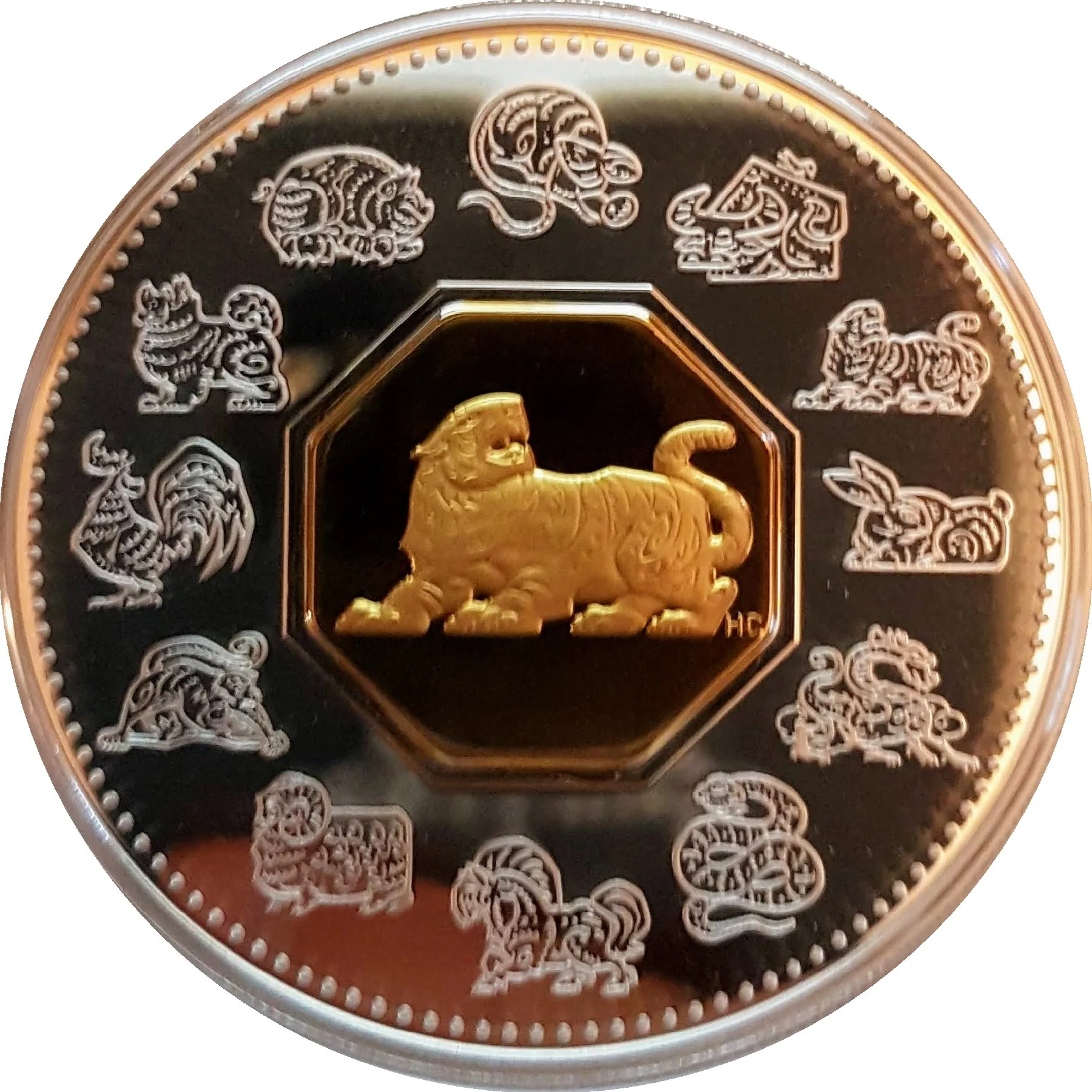 Gold-plated tiger cameo encircled by the twelve zodiac animals.