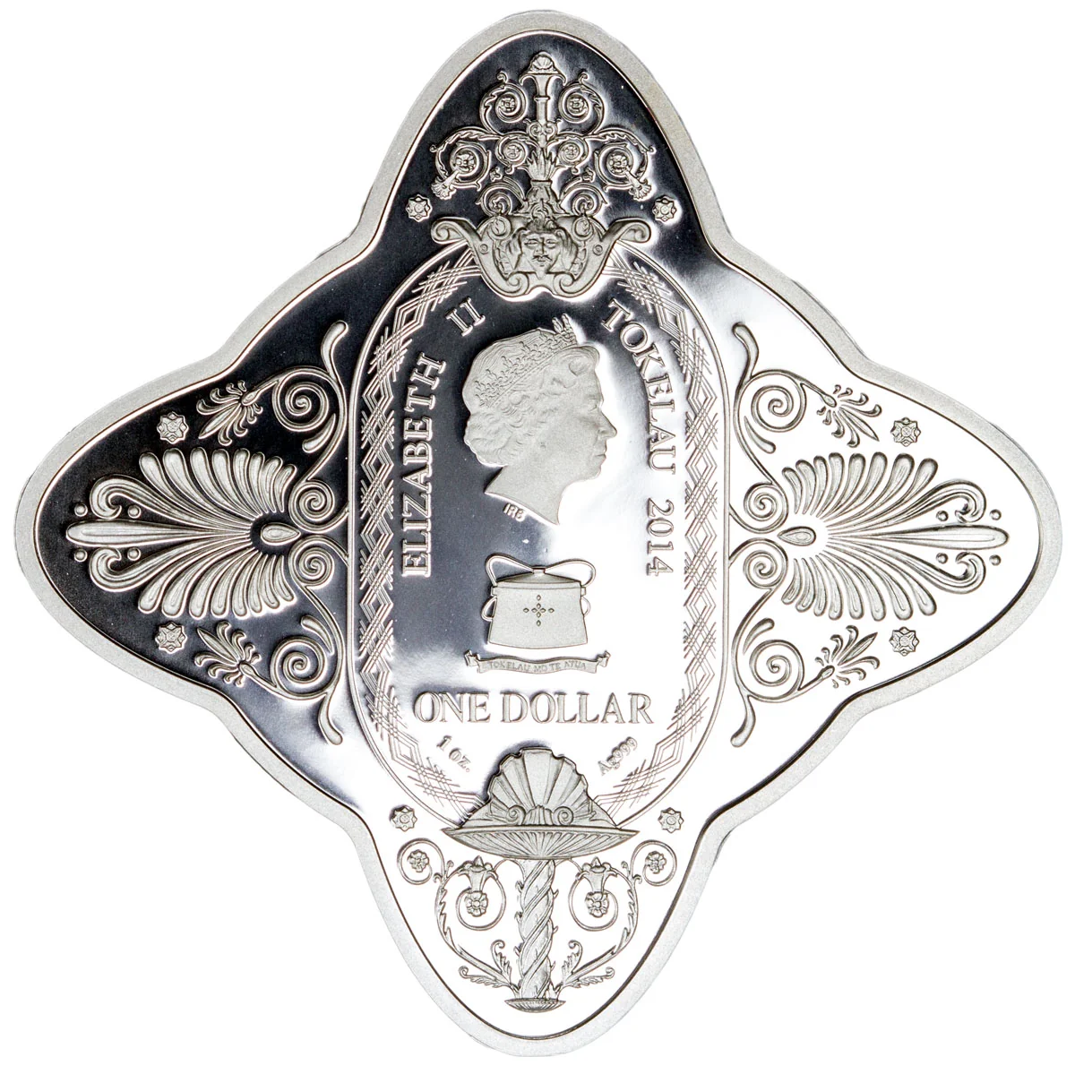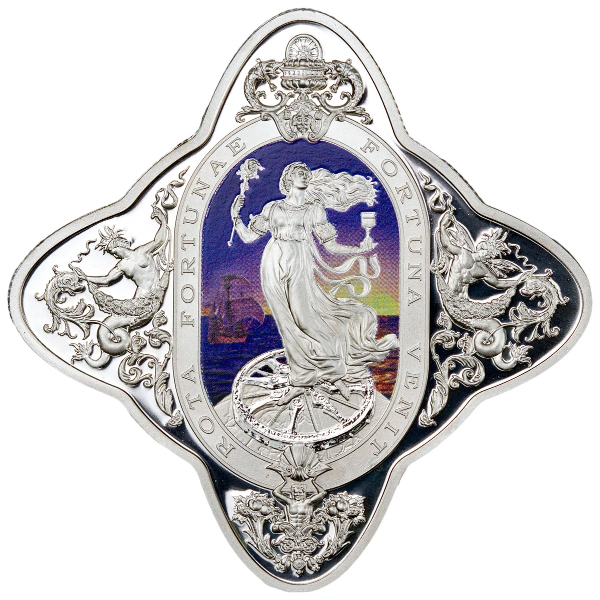 Fortuna on her wheel, with a sunset over a ship at sea.