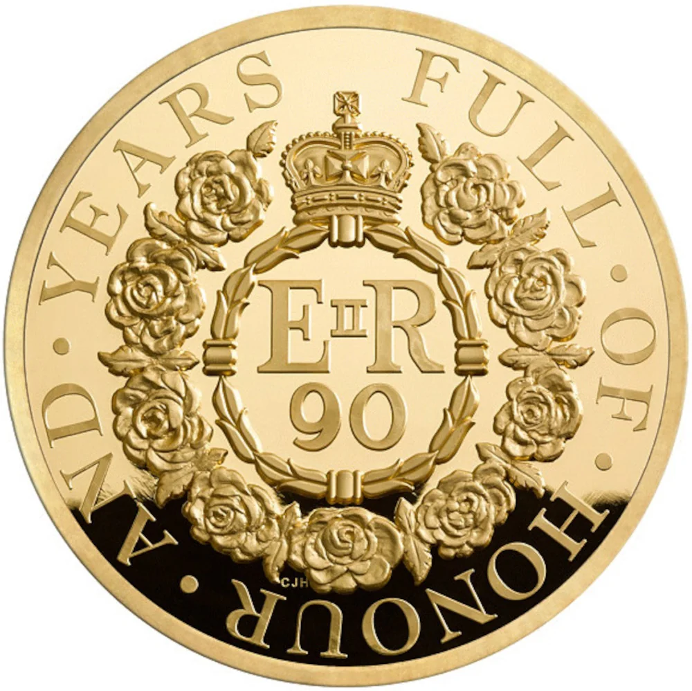 Crowned Royal Cypher above "90", encircled by nine roses.