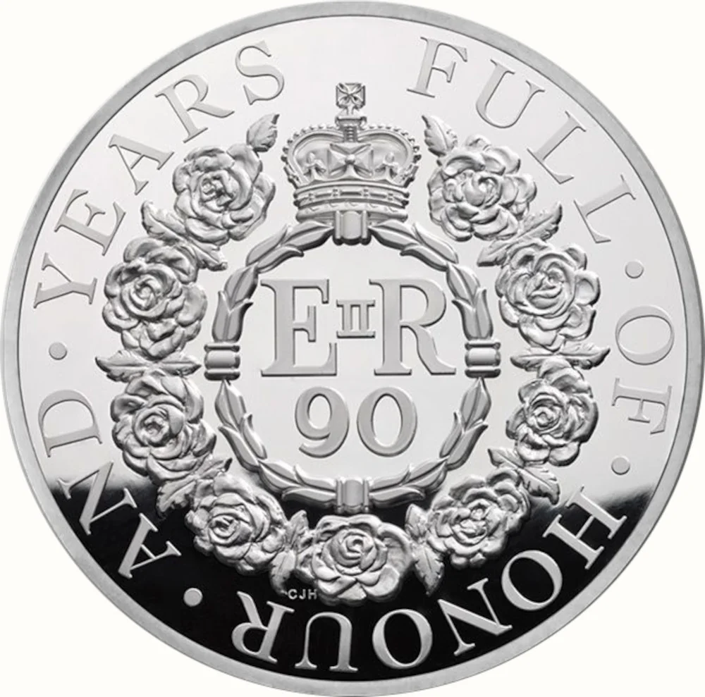 Crowned Royal Cypher above "90", encircled by nine roses.
